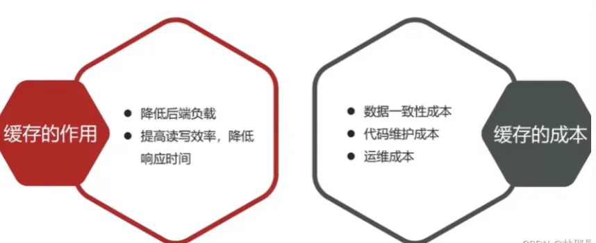 - 缓存数据存储于代码中,而代码运行在内存中,内存的读写性能远高于磁盘,通过缓存,可以大大降低用户访问并发量带来的服务器读写压力。