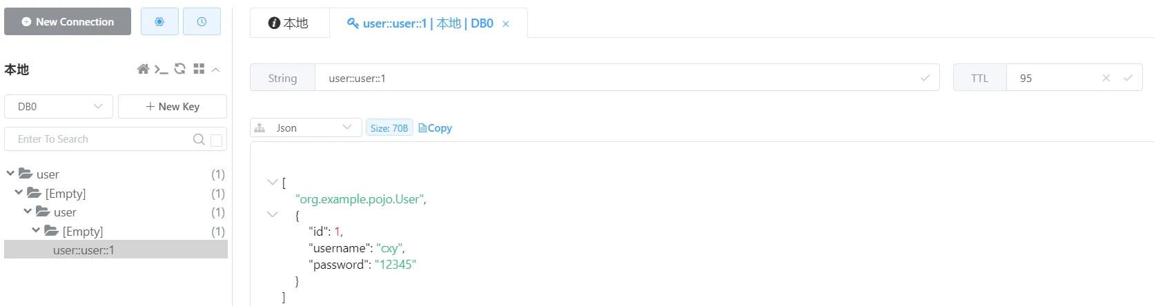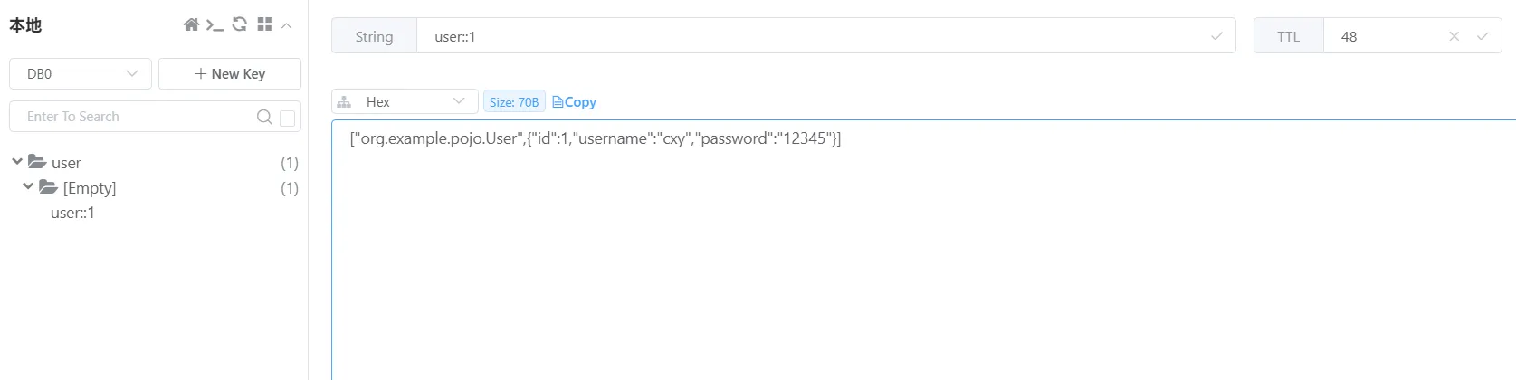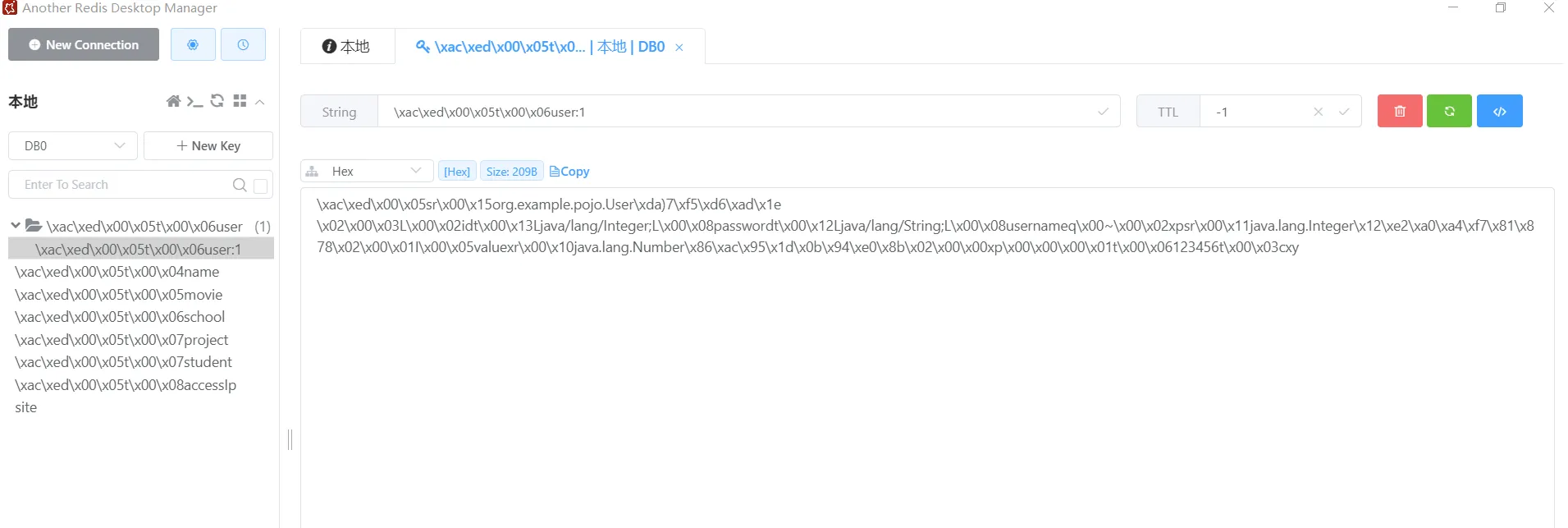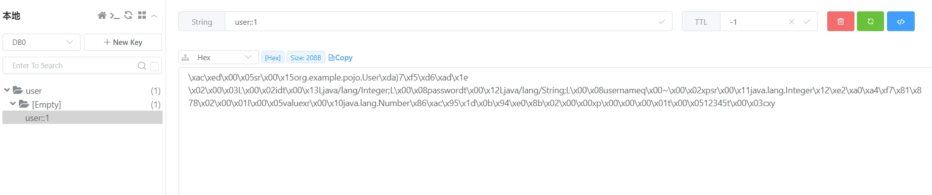 然后我们查看reids缓存,发现这个key的值是user::1,这个和我们之前定义的不太相同,而且没有过期时间,除此之外,这个value的值,序列化有问题