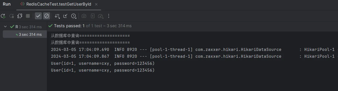 从上述内容中,可以看出,第一次查询时,因为数据不存在于缓存中,所以会查询数据库,第二次查询时,从缓存中查询到数据,直接返回。