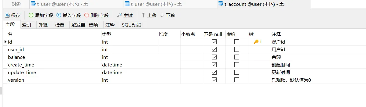 2. 基于数据库的分布式锁(乐观锁) 基于数据库的分布式锁实现方案,一般是在表中加一个字段,用于表示版本号,当读取数据时,会读取对应的版本号,在更新数据的时候,也会相应的更新版本号(比如版本号递增),且在更新数据的时候,会判断当前版本号是否正确,以账户余额修改为例,具体流程如下: 1)查询账户信息(此时从数据库中查出的版本号为version1) 2)根据请求对账户对象进行操作 3)更新数据库(update t_account set 字段=新值, version = version + 1 where id = #{accountId} and version = version1的值) 在这个过程中,最重要的就是更新sql的语句,也就是在更新的时候,判断版本号是否被修改过,只有没有被修改过,我们才能更新成功。 示例如下: 首先,我们创建一个账户表: