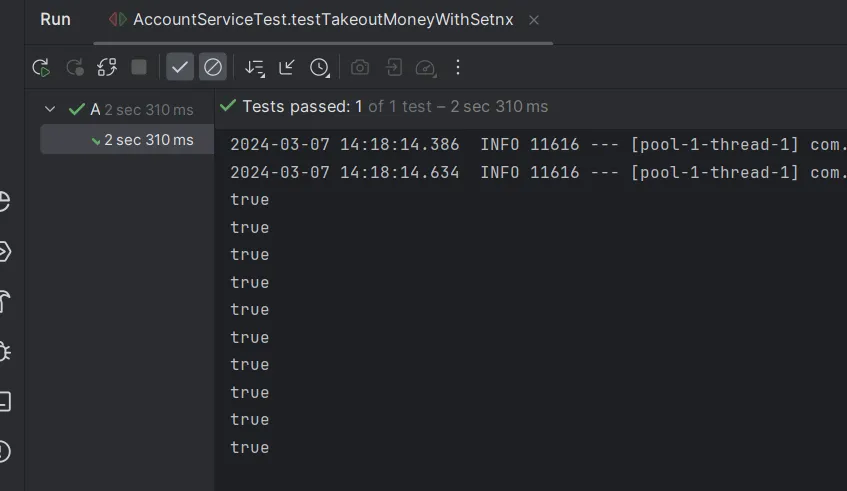 1 2 3 4 5 6 7 8 9 10 11 12 13 14 15 16 17 18 19 @Test public void testTakeoutMoneyWithSetnx () throws ExecutionException, InterruptedException { ExecutorService executorService = Executors.newFixedThreadPool(5 ); Callable<Boolean> takeoutTask = () -> { TakeOutMoneyRequest request = new TakeOutMoneyRequest (); request.setAccountId(1 ); request.setMoney(100 ); return accountService.takeOutMoneyWithSetnx(request); }; List<Future<Boolean>> futureList = new ArrayList <>(); for (int i = 0 ; i < 10 ; i++) { Future<Boolean> future = executorService.submit(takeoutTask); futureList.add(future); } for (Future<Boolean> future : futureList) { System.out.println(future.get()); } }