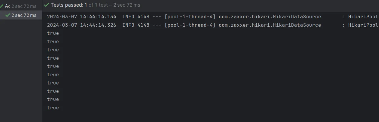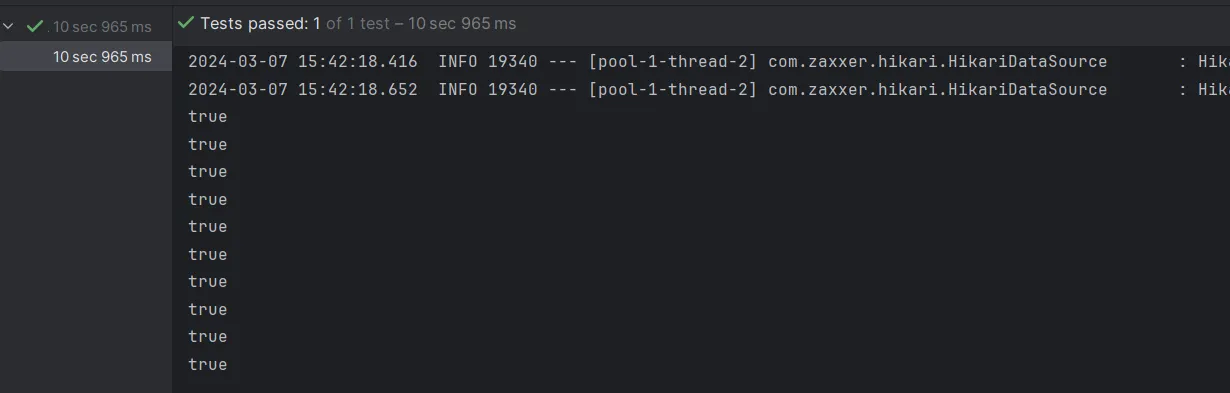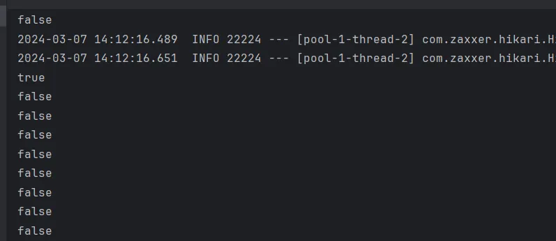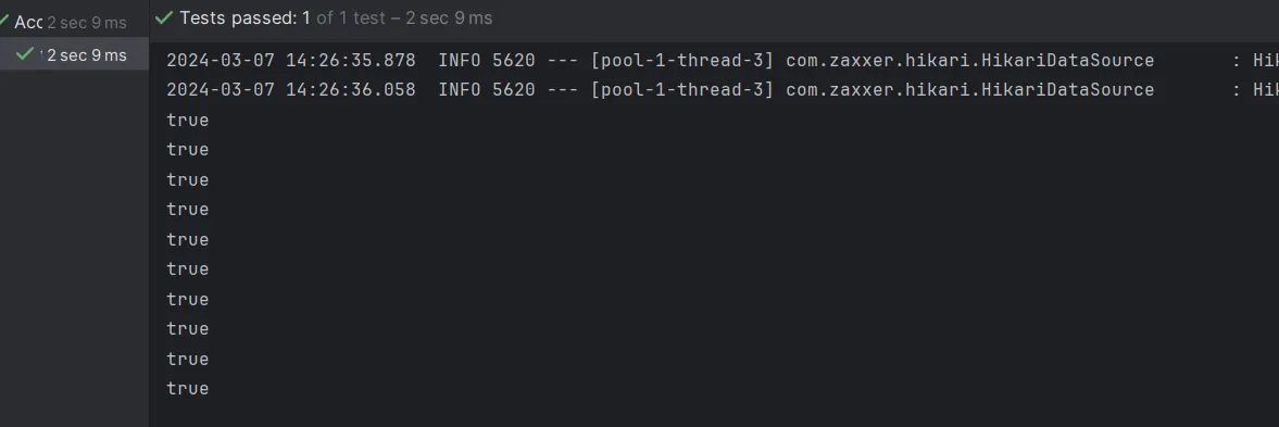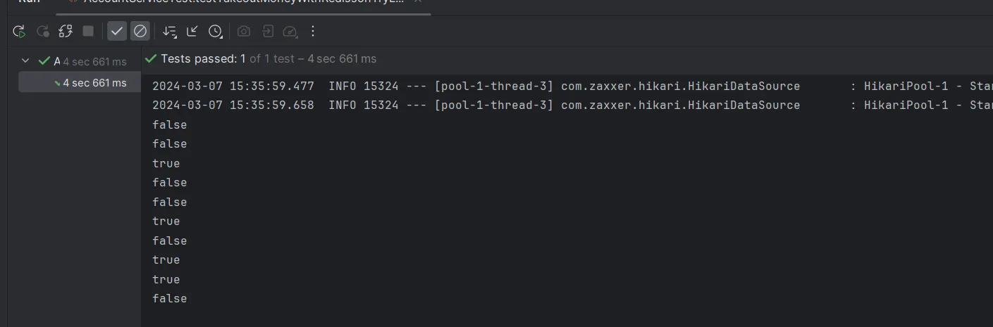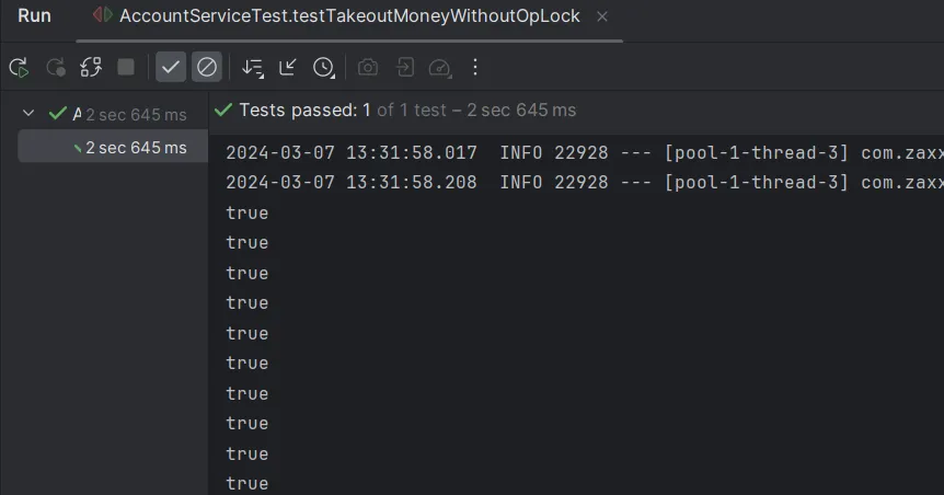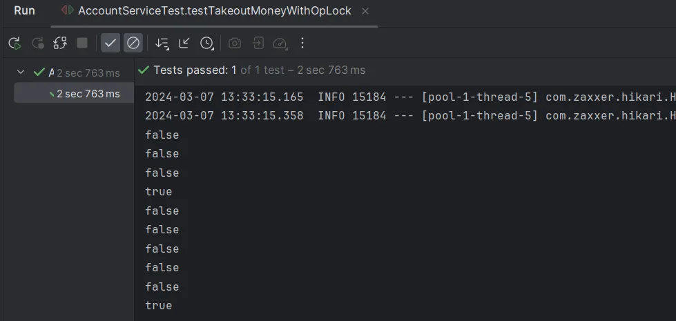 1 2 3 4 5 6 7 8 9 10 11 12 13 14 15 16 17 18 19 20 21 22 23 @Test public void testTakeoutMoneyWithOpLock () throws ExecutionException, InterruptedException { ExecutorService executorService = Executors.newFixedThreadPool(5 ); Callable<Boolean> takeoutTask = () -> { TakeOutMoneyRequest request = new TakeOutMoneyRequest (); request.setAccountId(1 ); request.setMoney(100 ); try { return accountService.takeOutMoneyWithOpLock(request); } catch (InterruptedException e) { return false ; } }; List<Future<Boolean>> futureList = new ArrayList <>(); for (int i = 0 ; i < 10 ; i++) { Future<Boolean> future = executorService.submit(takeoutTask); futureList.add(future); } for (Future<Boolean> future : futureList) { System.out.println(future.get()); } }