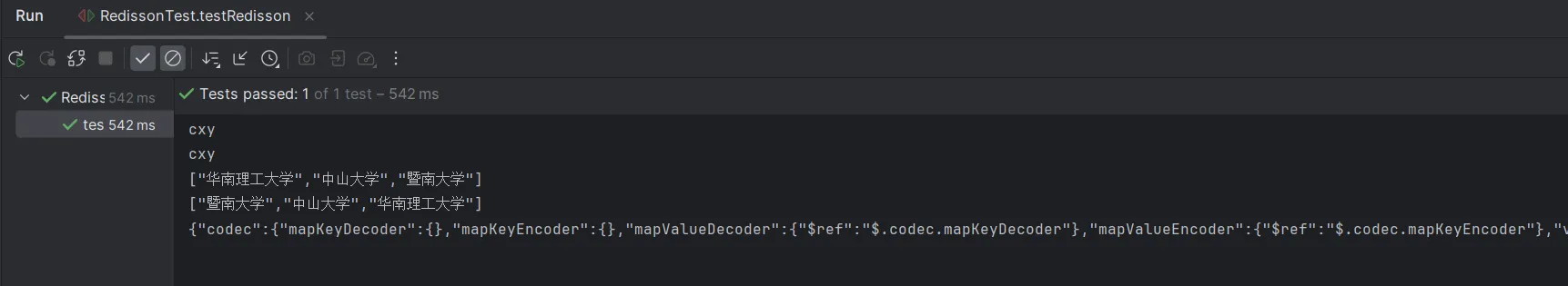 1 2 3 4 5 6 7 8 9 10 11 12 13 14 15 16 17 18 19 20 21 22 23 24 25 26 27 28 29 30 31 32 33 34 35 36 37 38 39 40 41 42 43 44 45 46 47 48 49 50 51 52 53 package org.example;import com.alibaba.fastjson.JSONObject;import org.junit.jupiter.api.Test;import org.redisson.api.*;import org.springframework.beans.factory.annotation.Autowired;import org.springframework.boot.test.context.SpringBootTest;import java.util.concurrent.TimeUnit;@SpringBootTest public class RedissonTest { @Autowired private RedissonClient redissonClient; @Test public void testRedisson () { RBucket<Object> rBuck = redissonClient.getBucket("name" ); rBuck.set("cxy" , 30 , TimeUnit.SECONDS); System.out.println(redissonClient.getBucket("name" ).get()); RMap<Object, Object> student = redissonClient.getMap("student" ); student.put("id" , 1 ); student.put("name" , "cxy" ); student.put("age" , 20 ); student.expire(30 , TimeUnit.SECONDS); System.out.println(redissonClient.getMap("student" ).get("name" )); RList<Object> schools = redissonClient.getList("schools" ); schools.add("华南理工大学" ); schools.add("中山大学" ); schools.add("暨南大学" ); System.out.println(JSONObject.toJSONString(redissonClient.getList("schools" ))); RSet<Object> schoolSet = redissonClient.getSet("schoolSet" ); schoolSet.add("华南理工大学" ); schoolSet.add("中山大学" ); schoolSet.add("暨南大学" ); System.out.println(JSONObject.toJSONString(redissonClient.getSet("schoolSet" ))); RScoredSortedSet<Object> schoolScoreSet = redissonClient.getScoredSortedSet("schoolScoreSet" ); schoolScoreSet.add(100d , "华南理工大学" ); schoolScoreSet.add(90d , "中山大学" ); schoolScoreSet.add(80d , "暨南大学" ); System.out.println(JSONObject.toJSONString(redissonClient.getScoredSortedSet("schoolScoreSet" ))); } }
