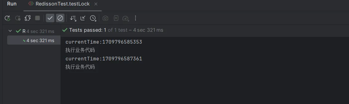 1 2 3 4 5 6 7 8 9 10 11 12 13 14 15 16 17 18 19 20 21 22 23 24 25 26 27 28 29 30 @Test public void testLock () throws ExecutionException, InterruptedException { ExecutorService executorService = Executors.newFixedThreadPool(2 ); Runnable lockTask = () -> { try { lock(); } catch (InterruptedException e) { e.printStackTrace(); } }; List< Future> futureList = new ArrayList <>(); for (int i = 0 ; i < 2 ; i++) { futureList.add(executorService.submit(lockTask)); } for (Future future : futureList) { future.get(); } } private void lock () throws InterruptedException { RLock myLock = redissonClient.getLock("myLock" ); myLock.lock(); try { System.out.println("currentTime:" + System.currentTimeMillis()); Thread.sleep(2000 ); System.out.println("执行业务代码" ); } finally { myLock.unlock(); } }