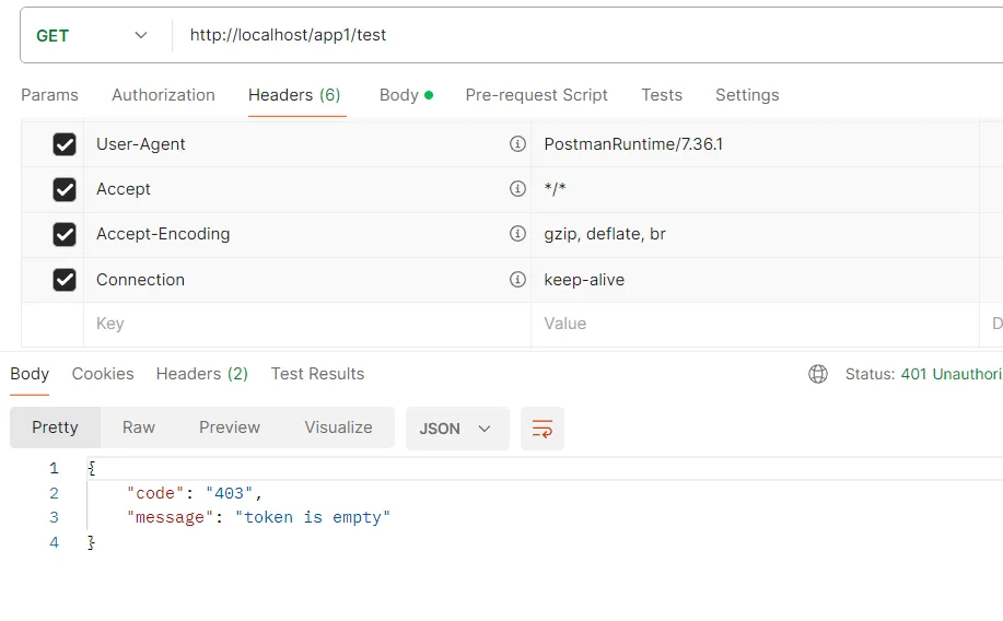 由于没有携带token,因此被拦截住,假设我们现在在请求头上添加token,再次访问,结果如下: