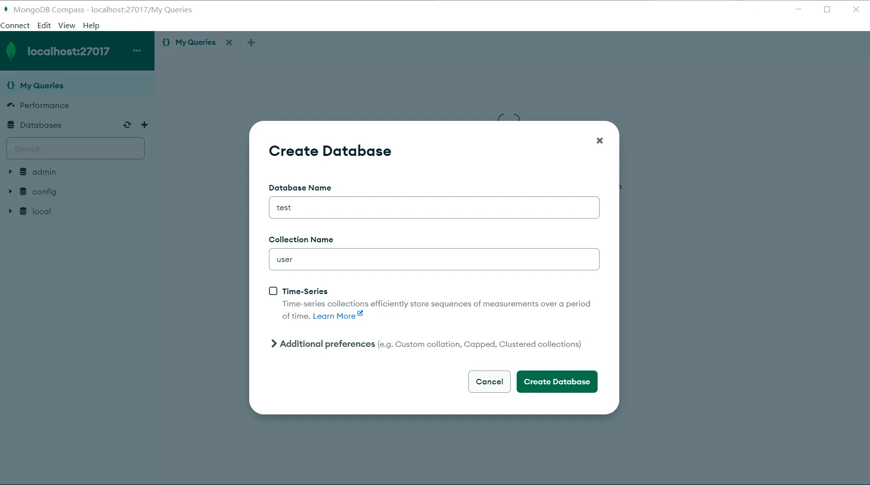 首先,我们创建一个test数据库,在这个数据库中,创建一个user集合,用于演示: