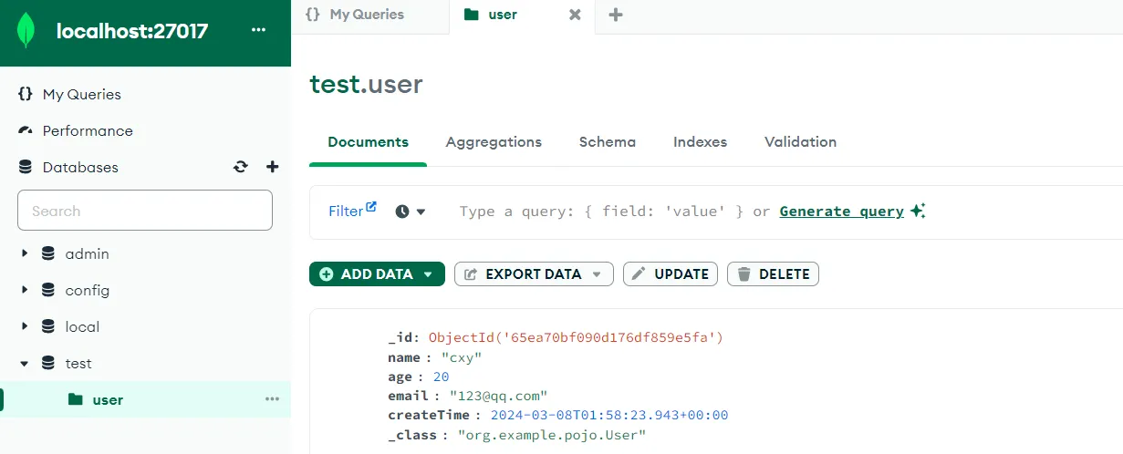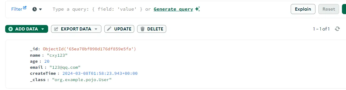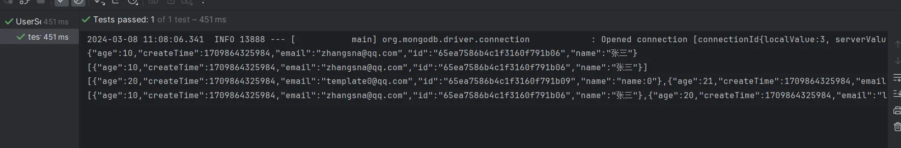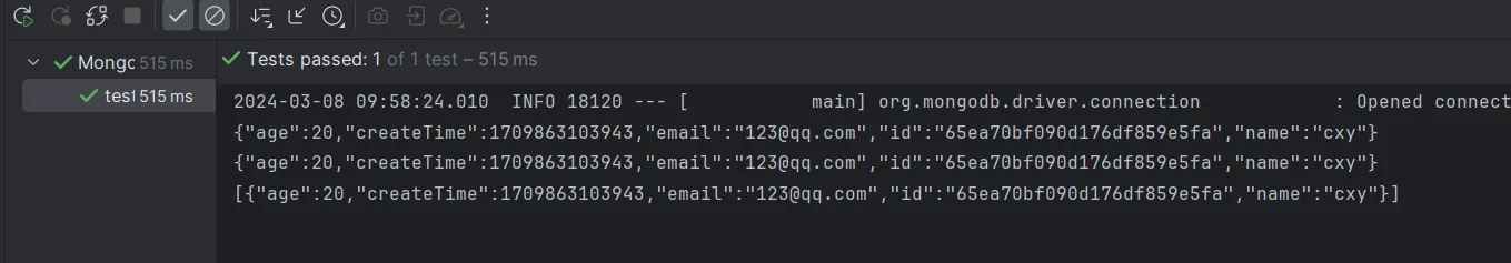 | @Test public void testInsertAndSimpleFind() { User createUser = new User(); createUser.setAge(20); createUser.setName("cxy"); createUser.setEmail("123@qq.com"); createUser.setCreateTime(new Date()); createUser = mongoTemplate.insert(createUser); System.out.println(JSONObject.toJSONString(createUser));