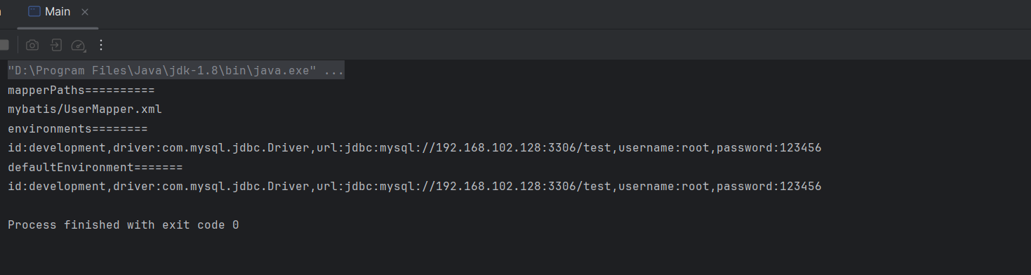 1 2 3 4 5 6 7 8 9 10 11 12 13 14 15 16 17 18 19 20 21 22 23 IMybatisConfigurationParser mybatisConfigurationParser = new XmlMybatisConfigurationParser(); MybatisConfiguration mybatisConfiguration = mybatisConfigurationParser.parser("mybatis-config.xml" ); System.out.println("mapperPaths==========" ); for (String mapperPath : mybatisConfiguration.getMapperPaths()) { System.out.println(mapperPath); } System.out.println("environments========" ); for (MybatisEnvironment environment : mybatisConfiguration.getEnvironments()) { MybatisDataSource mybatisDataSource = environment.getMybatisDataSource(); System.out.println("id:" + environment.getId() + ",driver:" + mybatisDataSource.getDriver() + ",url:" + mybatisDataSource.getUrl() + ",username:" + mybatisDataSource.getUsername() + ",password:" + mybatisDataSource.getPassword()); } System.out.println("defaultEnvironment=======" ); MybatisEnvironment defaultMybatisEnvironment = mybatisConfiguration.getDefaultMybatisEnvironment(); MybatisDataSource mybatisDataSource = defaultMybatisEnvironment.getMybatisDataSource(); System.out.println("id:" + defaultMybatisEnvironment.getId() + ",driver:" + mybatisDataSource.getDriver() + ",url:" + mybatisDataSource.getUrl() + ",username:" + mybatisDataSource.getUsername() + ",password:" + mybatisDataSource.getPassword());