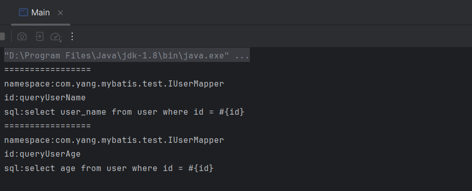 1 2 3 4 5 6 7 8 9 10 11 12 13 14 <?xml version="1.0" encoding="UTF-8" ?> <!DOCTYPE mapper PUBLIC "-//mybatis.org//DTD Mapper 3.0//EN" "http://mybatis.org/dtd/mybatis-3-mapper.dtd" > <mapper namespace="com.yang.mybatis.test.IUserMapper" > <select id="queryUserName" > select user_name from user where id = #{ id} </select> <select id="queryUserAge" > select age from user where id = #{ id} </select> </mapper>