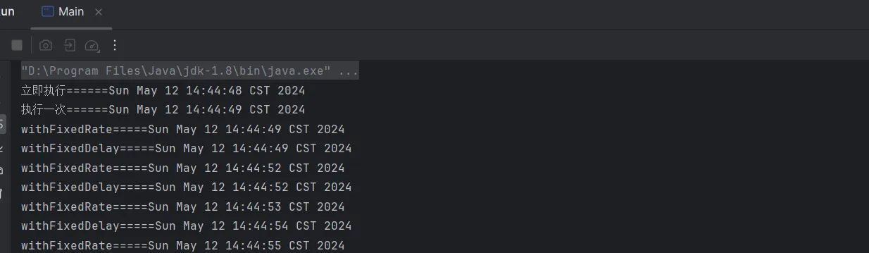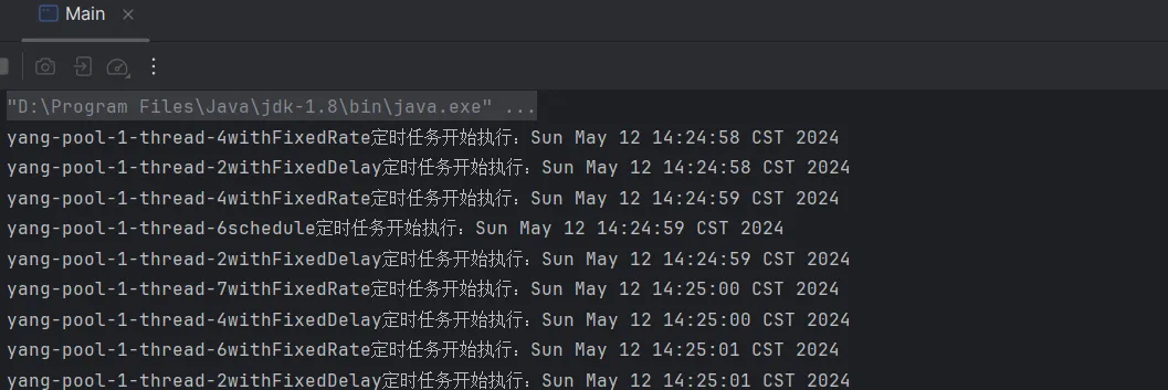 yangJobManager.scheduleWithFixedRate(() -> { System.out.println(Thread.currentThread().getName() + "withFixedRate定时任务开始执行:" + new Date()); }, 0L, 1L);