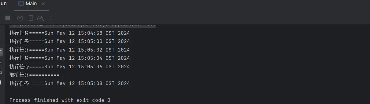 在该方法中,我们提交任务,该任务间隔时间为2秒,10秒过后,取消任务,取消任务过后,再睡眠10秒,在后面10秒钟,不会执行任务(或执行一次,因为在cancel之前刚好有任务没执行完),执行结果如下: