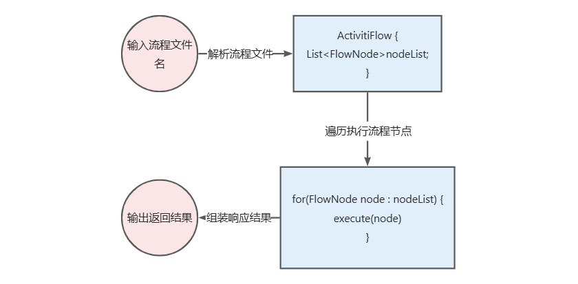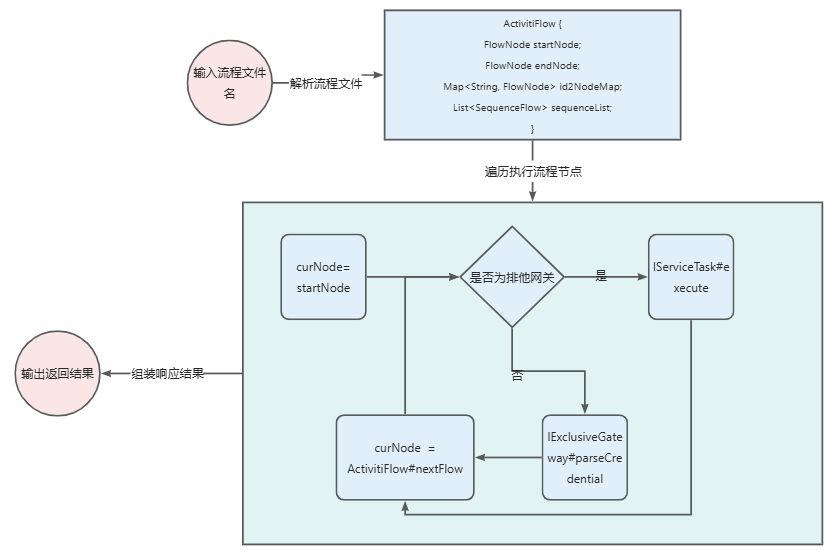 /** * 流程引擎执行方法 * @param flowName * @param activitiEngineRequest * @return * @param <Request> * @param <Response> */ public static <Request, Response> ActivitiEngineResponse<Response> startEngine(String flowName, ActivitiEngineRequest<Request> activitiEngineRequest) { ActivitiFlow activitiFlow = getActivitiFlow(flowName); ActivitiEngineResponse<Response> activitiEngineResponse = new ActivitiEngineResponse<>(); FlowNode curNode = activitiFlow.getStartNode(); while (curNode != null) { FlowNodeType flowNodeType = curNode.getFlowNodeType(); FlowNode nextFlow = null; switch (flowNodeType) { case START_EVENT: break; case END_EVENT: break; case SERVICE_TASK: executeServiceTask(activitiEngineRequest, activitiEngineResponse, curNode); break; case EXCLUSIVE_GATEWAY: nextFlow = executeExclusiveGateway(activitiEngineRequest, activitiEngineResponse, curNode, activitiFlow); break; } if (nextFlow != null) { curNode = nextFlow; } else { curNode = activitiFlow.getNextNode(curNode); } } return activitiEngineResponse; }